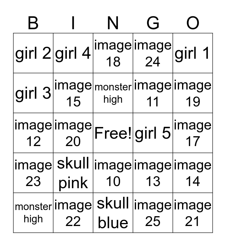 This bingo card has a free space and 25 words: skull pink, skull blue, monster high, monster high, girl 1, girl 2, girl 3, girl 4, girl 5, image 10, image 11, image 12, image 13, image 14, image 15, image 16, image 17, image 18, image 19, image 20, image 21, image 22, image 23, image 24 and image 25.