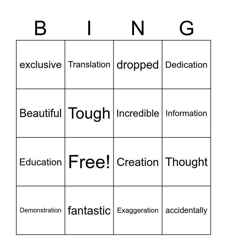 This bingo card has 18 words: Free!, accidentally, dropped, exclusive, Creation, Dedication, Demonstration, Translation, Information, Education, Exaggeration, Beautiful, Thought, Tough, Incredible, brilliant, fantastic and fabulous.
