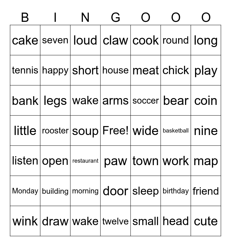 This bingo card has a free space and 48 words: sleep, chick, twelve, rooster, wake, nine, seven, draw, round, paw, long, claw, bear, soccer, Monday, basketball, tennis, play, birthday, cook, meat, soup, cake, happy, friend, short, coin, wink, arms, legs, head, wide, map, building, little, town, work, bank, restaurant, morning, listen, cute, loud, wake, house, door, open and small.