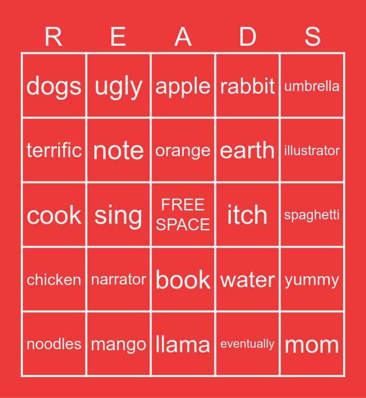 This bingo card has a free space and 24 words: narrator, mango, orange, noodles, umbrella, dogs, terrific, ugly, itch, book, earth, cook, water, yummy, note, eventually, spaghetti, apple, illustrator, sing, mom, chicken, rabbit and llama.