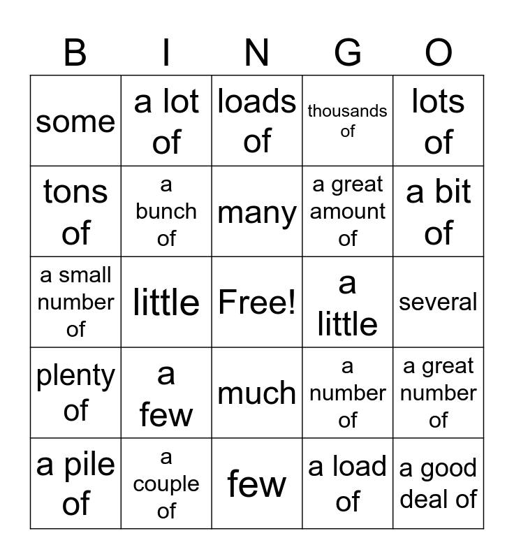 This bingo card has a free space and 24 words: a pile of, a few, many, a load of, lots of, some, a lot of, loads of, a little, several, a small number of, a bunch of, a number of, a great number of, tons of, a couple of, few, thousands of, a bit of, plenty of, little, much, a great amount of and a good deal of.