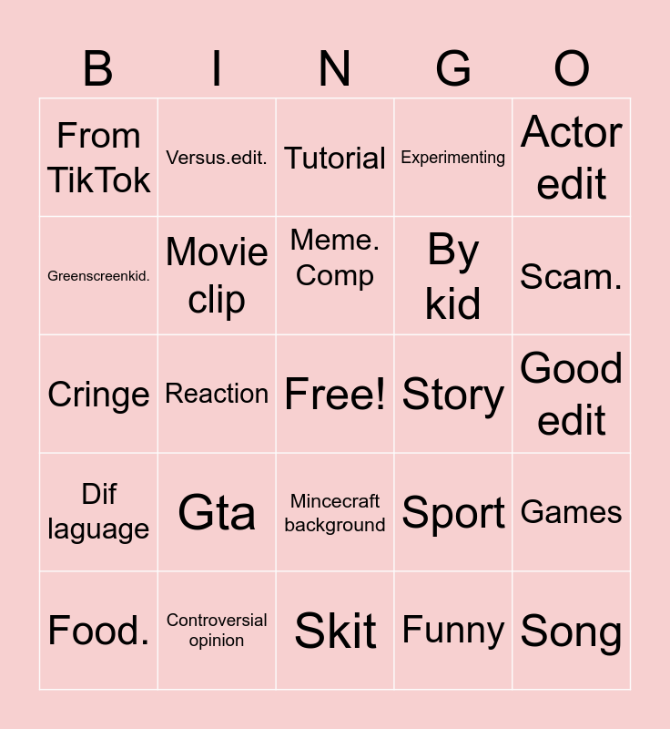 This bingo card has a free space and 24 words: Gta, Controversial opinion, Meme. Comp, Food., Actor edit, From TikTok, Greenscreenkid., Versus.edit., Story, Mincecraft background, By kid, Cringe, Sport, Games, Movie clip, Funny, Good edit, Tutorial, Scam., Reaction, Song, Dif laguage, Experimenting and Skit.