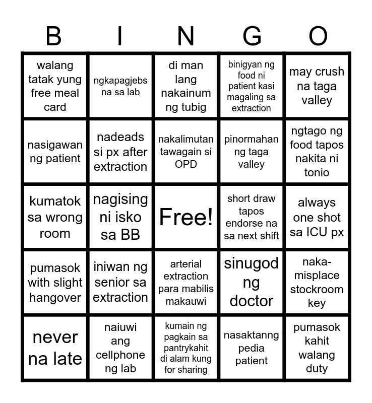This bingo card has a free space and 24 words: never na late, iniwan ng senior sa extraction, nakalimutan tawagain si OPD, nasaktanng pedia patient, may crush na taga valley, walang tatak yung free meal card, ngkapagjebs na sa lab, di man lang nakainum ng tubig, short draw tapos endorse na sa next shift, always one shot sa ICU px, kumatok sa wrong room, nadeads si px after extraction, sinugod ng doctor, naka- misplace stockroom key, nasigawan ng patient, naiuwi ang cellphone ng lab, kumain ng pagkain sa pantrykahit di alam kung for sharing, binigyan ng food ni patient kasi magaling sa extraction, ngtago ng food tapos nakita ni tonio, pumasok with slight hangover, nagising ni isko sa BB, arterial extraction para mabilis makauwi, pinormahan ng taga valley and pumasok kahit walang duty.