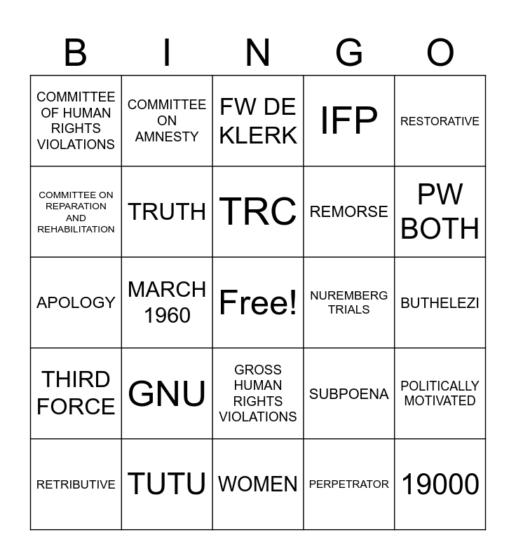 This bingo card has a free space and 24 words: GNU, TUTU, TRC, RETRIBUTIVE, RESTORATIVE, COMMITTEE OF HUMAN RIGHTS VIOLATIONS, COMMITTEE ON REPARATION AND REHABILITATION, COMMITTEE ON AMNESTY, NUREMBERG TRIALS, GROSS HUMAN RIGHTS VIOLATIONS, REMORSE, APOLOGY, SUBPOENA, POLITICALLY MOTIVATED, TRUTH, PERPETRATOR, BUTHELEZI, FW DE KLERK, PW BOTH, MARCH 1960, 19000, THIRD FORCE, IFP and WOMEN.