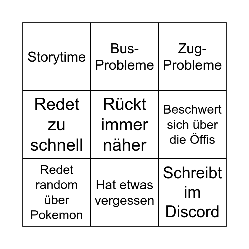 This bingo card has a free space and 8 words: Beschwert sich über die Öffis, Zug-Probleme, Bus-Probleme, Redet random über Pokemon, Storytime, Schreibt im Discord, Redet zu schnell and Hat etwas vergessen.