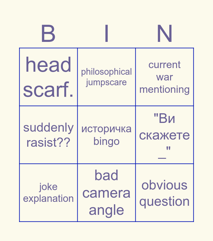 This bingo card has a free space and 8 words: "Ви скажете _", current war mentioning, philosophical jumpscare, joke explanation, head scarf., obvious question, suddenly rasist?? and bad camera angle.