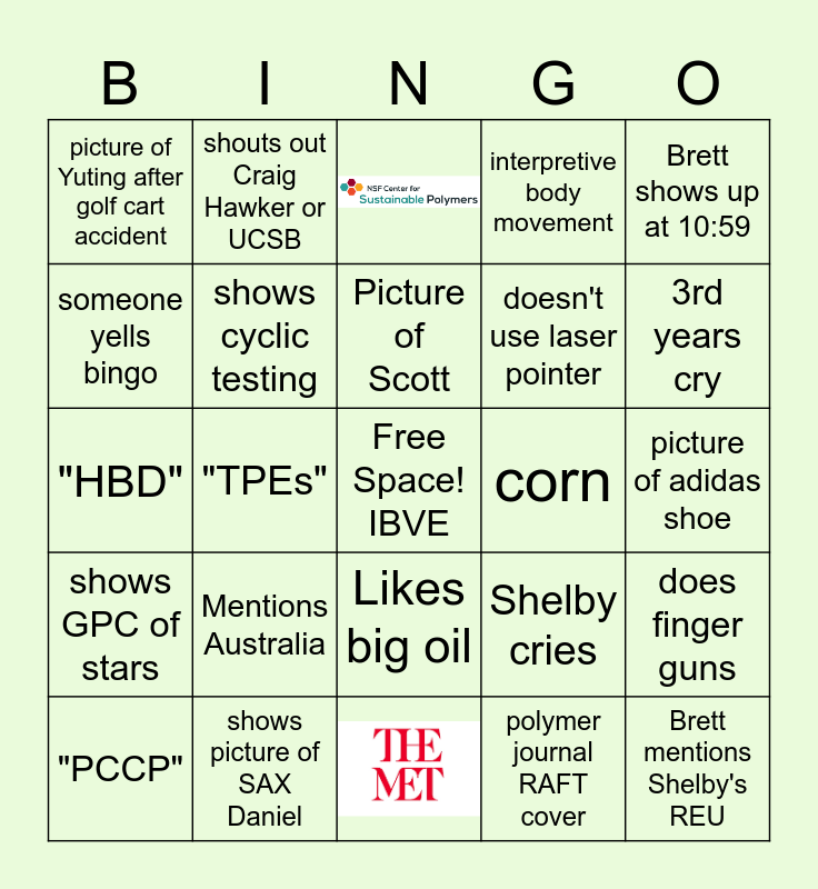 This bingo card has 2 images, a free space and 25 words: Shelby cries, Acknowledgements > 2 min, doesn't use laser pointer, someone yells bingo, shouts out Craig Hawker or UCSB, shows GPC of stars, corn, does finger guns, "HBD", interpretive body movement, "PCCP", shows picture of SAX Daniel, 3rd years cry, Shelby wears fun colors, shows cyclic testing, Picture of Scott, Mentions Australia, picture of Yuting after golf cart accident, picture of adidas shoe, polymer journal RAFT cover, "TPEs", Brett mentions Shelby's REU, Likes big oil, Brett shows up at 10:59 and you see yourself in the acknowledgements.