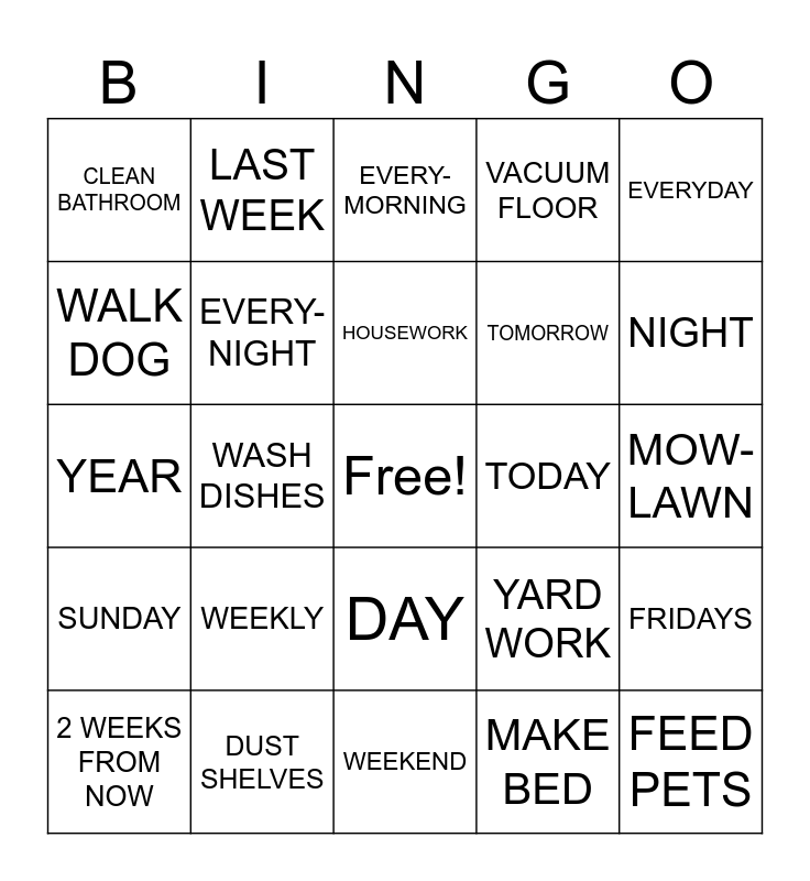 This bingo card has a free space and 42 words: CHORES, HOUSEWORK, DUTY, WEEKLY, MAKE BED, FRIDAYS, FEED PETS, BABYSIT, EVERY-MORNING, DAY, MOW-LAWN, NIGHT, WASH DISHES, EVERYDAY, AFTERNOON, YARD WORK, HOUR, YEAR, WATER PLANTS, LAST WEEK, WALK DOG, MONTHLY, CLEAN, CLEAN BATHROOM, WEDNESDAYS, TAKE-OUT TRASH, TOMORROW, LAUNDRY, MAKE COFFEE, NEXT WEEK, YESTERDAY, SUNDAY, EVERY-NIGHT, WEEKEND, 2 WEEKS AGO, 2 WEEKS FROM NOW, DUST SHELVES, TODAY, CLEAN TABLE, CLEAN ROOM, VACUUM FLOOR and WASH CAR.