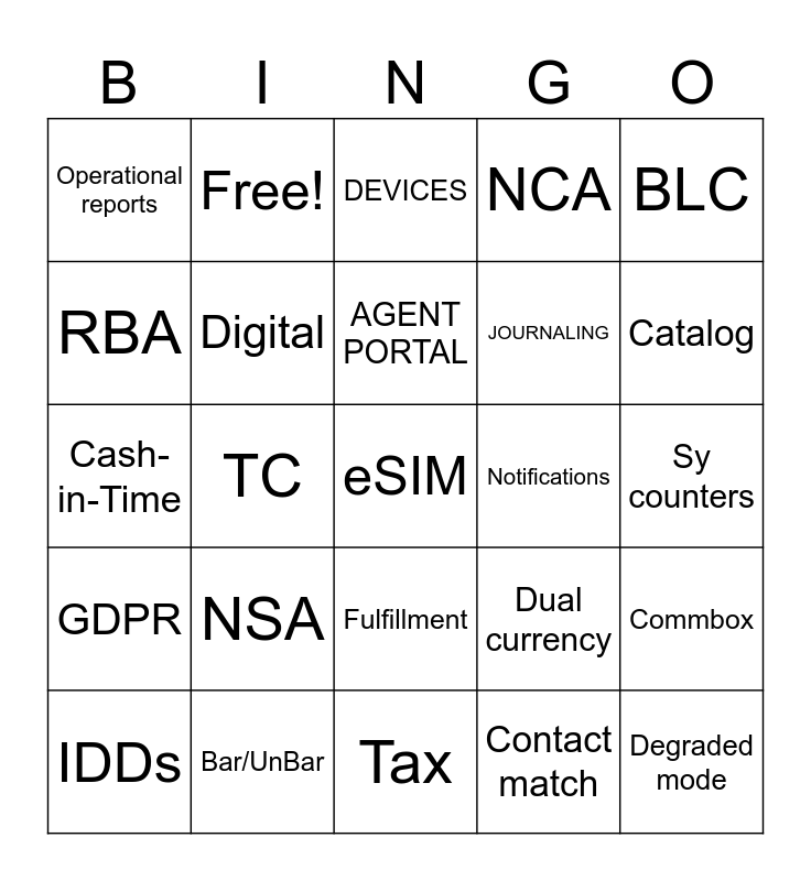 This bingo card has 25 words: NSA, Tax, AGENT PORTAL, IDDs, BLC, Operational reports, RBA, Free!, Notifications, Fulfillment, JOURNALING, Cash-in-Time, Dual currency, Commbox, Digital, Degraded mode, Sy counters, DEVICES, Catalog, TC, eSIM, Bar/UnBar, GDPR, NCA and Contact match.
