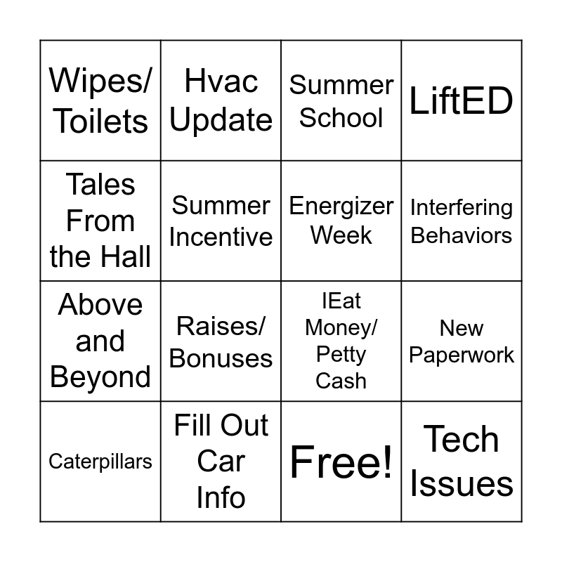 This bingo card has 17 words: Free!, Caterpillars, Summer School, Wipes/ Toilets, Raises/ Bonuses, LiftED, New Paperwork, Energizer Week, Interfering Behaviors, Summer Incentive, Fill Out Car Info, IEat Money/ Petty Cash, Tales From the Hall, Hvac Update, Above and Beyond, Someone not Muted and Tech Issues.