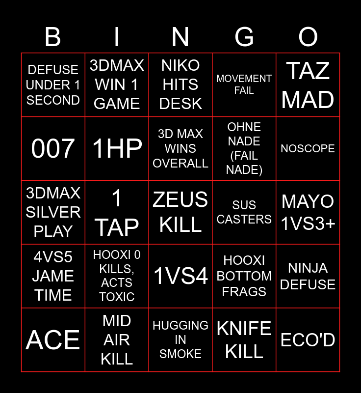 This bingo card has a free space and 24 words: HOOXI 0 KILLS, ACTS TOXIC, MID AIR KILL, 3D MAX WINS OVERALL, ACE, TAZ MAD, DEFUSE UNDER 1 SECOND, 007, 3DMAX WIN 1 GAME, SUS CASTERS, 1VS4, OHNE NADE (FAIL NADE), 3DMAX SILVER PLAY, HOOXI BOTTOM FRAGS, NINJA DEFUSE, 1HP, KNIFE KILL, MAYO 1VS3+, NIKO HITS DESK, NOSCOPE, 1 TAP, ECO'D, 4VS5 JAME TIME, MOVEMENT FAIL and HUGGING IN SMOKE.