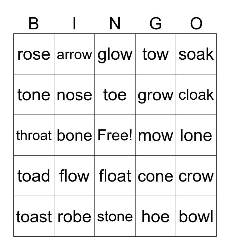 This bingo card has a free space and 24 words: flow, robe, toe, toast, soak, rose, tone, arrow, mow, float, grow, throat, cone, crow, nose, hoe, lone, glow, cloak, bone, bowl, toad, tow and stone.