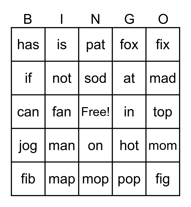 This bingo card has a free space and 24 words: man, map, sod, fib, fix, has, if, is, in, on, at, can, hot, mom, not, pop, top, pat, mad, fan, fig, jog, fox and mop.