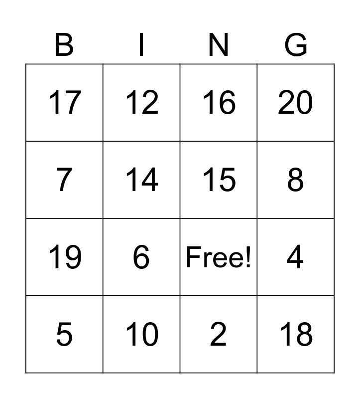 This bingo card has 22 words: 10, 11, 12, 13, 14, 15, 17, 16, Free!, 18, 19, 20, 0, 1, 2, 3, 4, 5, 6, 7, 8 and 9.