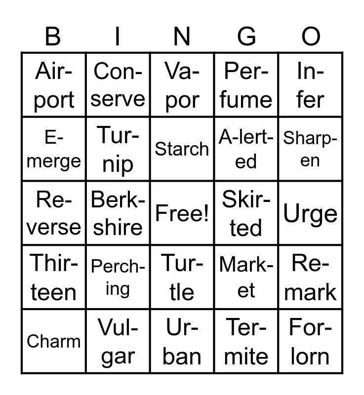 This bingo card has a free space and 30 words: Vul-gar, Gar-den, Berk-shire, Por-tion, Air-port, Va-por, Tur-nip, Tur-tle, Skir-ted, Ur-ban, Urge, For-lorn, Ter-mite, Stern, Sharp-en, Their, Mark-et, Thir-teen, Perch-ing, In-fer, Re-verse, Su-perb, Con-serve, A-lert-ed, E-merge, Per-fume, Re-mark, Charm, Starch and Con-firm.