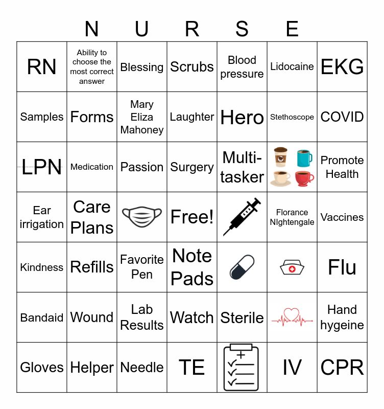 This bingo card has 9 images, a free space and 48 words: IV, Promote Health, SDoH, RN, Care Plans, Lab Results, EKG, Speculum, Forms, Watch, Scrubs, Bandaid, Kindness, Vaccines, Helper, Refills, Blood pressure, Hero, EMR, Stethoscope, COVID, Favorite Pen, Multi-tasker, Blessing, Shots, Samples, Florance NIghtengale, Compassion, Mary Eliza Mahoney, Note Pads, Fall prevention, Flu, Gloves, Needle, LPN, Lidocaine, Laughter, Wound, Medication, Ability to choose the most correct answer, Surgery, CPR, Sterile, Educate, Hand hygeine, Passion, Ear irrigation and TE.