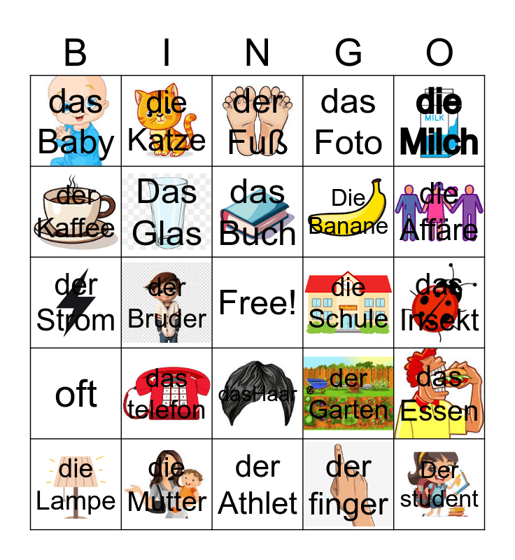 This bingo card has 21 images, a free space and 24 words: das telefon, die Mutter, das Buch, die Lampe, die Milch, das Baby, der Kaffee, die Katze, die Schule, dasHaar, Die Banane, der Strom, der Garten, das Essen, Das Glas, der finger, das Insekt, der Fuß, die Affäre, der Bruder, Der student, oft, das Foto and der Athlet.