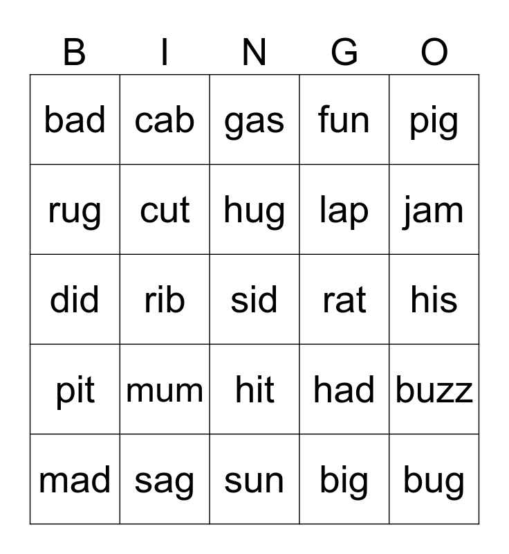 This bingo card has a free space and 24 words: mum, sag, hug, mad, pig, bad, rug, cab, rat, hit, lap, did, had, buzz, cut, big, his, gas, jam, rib, bug, pit, fun and sun.
