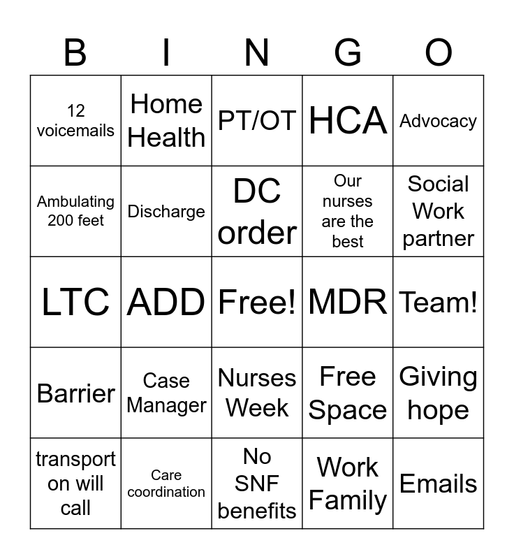 This bingo card has a free space and 25 words: Case Manager, No SNF benefits, DC order, transport on will call, Advocacy, 12 voicemails, Ambulating 200 feet, Home Health, MDR, Nurses Week, Our nurses are the best, LTC, Free Space, Giving hope, Discharge, DME, Team!, PT/OT, Social Work partner, ADD, Emails, Care coordination, Barrier, HCA and Work Family.