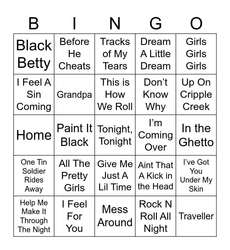 This bingo card has 50 words: Free!, Tonight, Tonight, Paul Revere, Mess Around, All The Pretty Girls, Missunderstood, Before He Cheats, Kerosene, I Feel A Sin Coming, Goodbye Earl, Grandpa, Dream A Little Dream, I’ve Got You Under My Skin, Aint That A Kick in the Head, Dream Lover, Twilight Zone, This is How We Roll, I’m Coming Over, Paranoid, Girls Girls Girls, Paint It Black, Rock N Roll All Night, Black Betty, Don’t Know Why, At Last, Traveller, Up On Cripple Creek, Queen of My Doublewide, Tracks of My Tears, Give Me Just A Lil Time, Knee Deep, All Summer Long, Angel, Come Over, I Feel For You, Rhythm of the Night, Southern Nights, End of Innocence, Blowing In The Wind, In the Ghetto, You Wear it Well, That’s Amore, Hurts so Good, Do You Believe in Magic, Help Me Make It Through The Night, Home, Games People Play, Rose Garden, One Tin Soldier Rides Away and 1979.