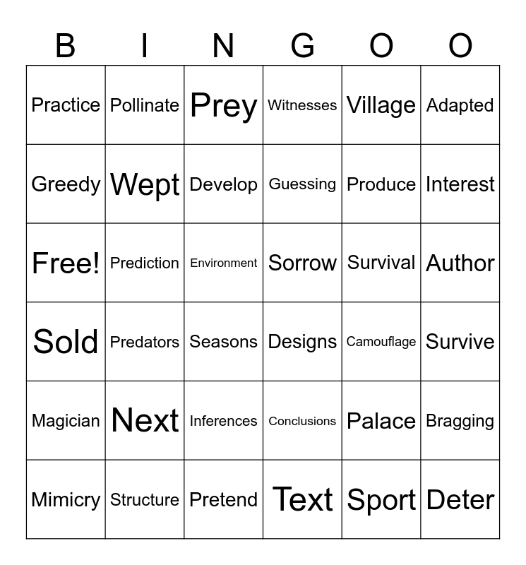 This bingo card has 36 words: Conclusions, Inferences, Text, Greedy, Sold, Sorrow, Wept, Pretend, Village, Palace, Interest, Witnesses, Bragging, Prediction, Guessing, Practice, Magician, Survival, Free!, Prey, Environment, Predators, Designs, Seasons, Camouflage, Pollinate, Produce, Structure, Develop, Adapted, Deter, Mimicry, Survive, Author, Next and Sport.