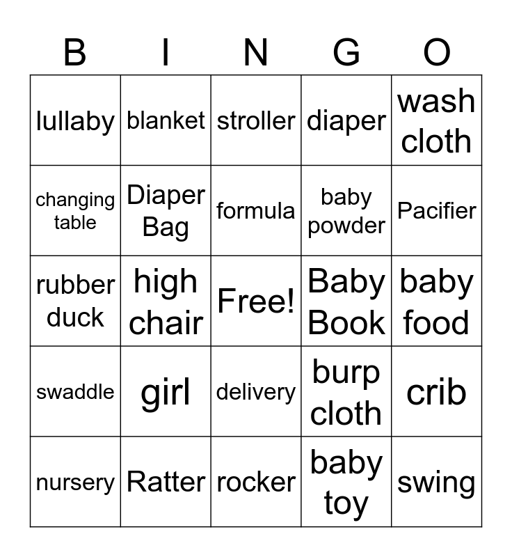 This bingo card has a free space and 29 words: nursery, boy, high chair, onesie, lullaby, stroller, Diaper Bag, girl, Baby Book, Ratter, baby food, swing, rocker, baby toy, Pacifier, bottle, delivery, swaddle, wash cloth, rubber duck, burp cloth, bib, baby powder, changing table, diaper, blanket, crib, formula and snuggle.