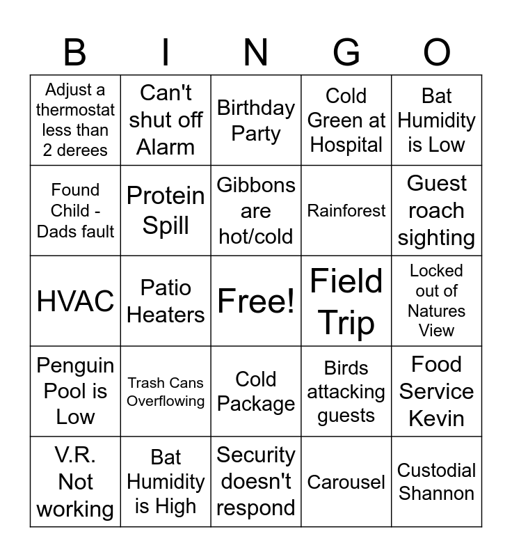 This bingo card has a free space and 25 words: Penguin Pool is Low, Bat Humidity is High, Security doesn't respond, Carousel, Bat Humidity is Low, Adjust a thermostat less than 2 derees, Can't shut off Alarm, Birthday Party, Field Trip, Food Service Kevin, Found Child - Dads fault, Protein Spill, Bathrooms out of soap, Birds attacking guests, Guest roach sighting, V.R. Not working, Patio Heaters, Gibbons are hot/cold, Rainforest, Locked out of Natures View, HVAC, Trash Cans Overflowing, Cold Package, Cold Green at Hospital and Custodial Shannon.