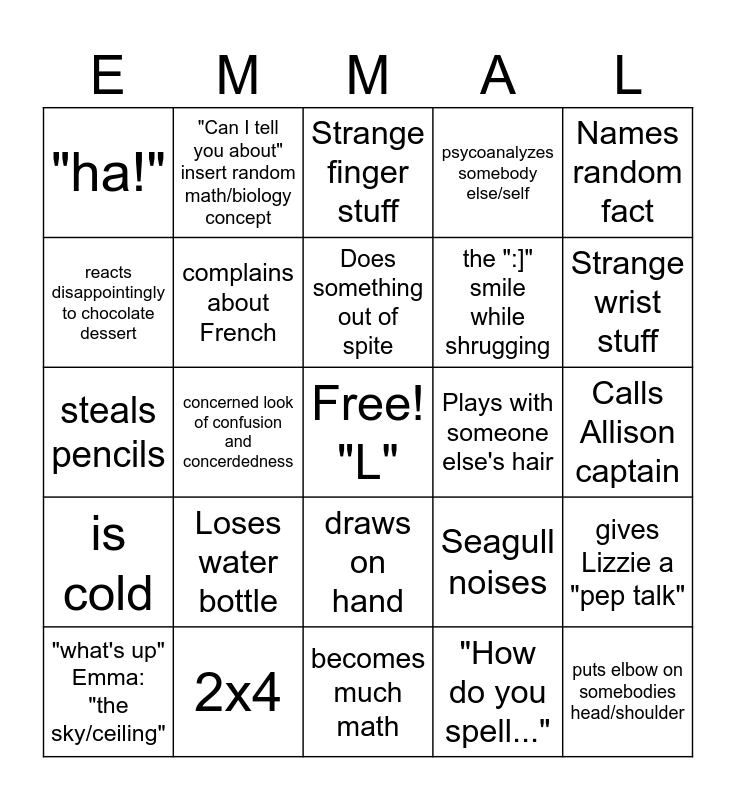 This bingo card has a free space and 24 words: Loses water bottle, 2x4, Does something out of spite, "what's up" Emma: "the sky/ceiling", Names random fact, "ha!", reacts disappointingly to chocolate dessert, "Can I tell you about" insert random math/biology concept, Plays with someone else's hair, draws on hand, the ":]" smile while shrugging, steals pencils, Seagull noises, gives Lizzie a "pep talk", complains about French, "How do you spell...", Calls Allison captain, Strange finger stuff, Strange wrist stuff, concerned look of confusion and concerdedness, puts elbow on somebodies head/shoulder, is cold, psycoanalyzes somebody else/self and becomes much math.