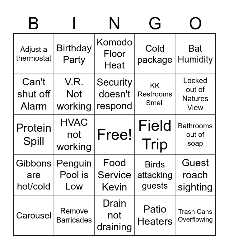 This bingo card has a free space and 24 words: Penguin Pool is Low, Remove Barricades, Security doesn't respond, Carousel, Bat Humidity, Adjust a thermostat, Can't shut off Alarm, Birthday Party, Field Trip, Food Service Kevin, KK Restrooms Smell, Protein Spill, Birds attacking guests, Guest roach sighting, V.R. Not working, Patio Heaters, Bathrooms out of soap, Komodo Floor Heat, Locked out of Natures View, HVAC not working, Trash Cans Overflowing, Gibbons are hot/cold, Cold package and Drain not draining.