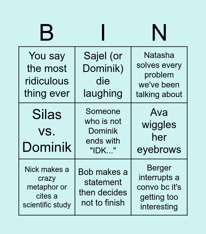 This bingo card has a free space and 11 words: Silas reveals his belly button, Bob makes a statement then decides not to finish, Berger interrupts a convo bc it's getting too interesting, Nick makes a crazy metaphor or cites a scientific study, Sajel (or Dominik) die laughing, Natasha solves every problem we've been talking about, Ava wiggles her eyebrows, Charlotte does some hand gestures, Silas vs. Dominik, You say the most ridiculous thing ever and Dominik finally says he knows something.
