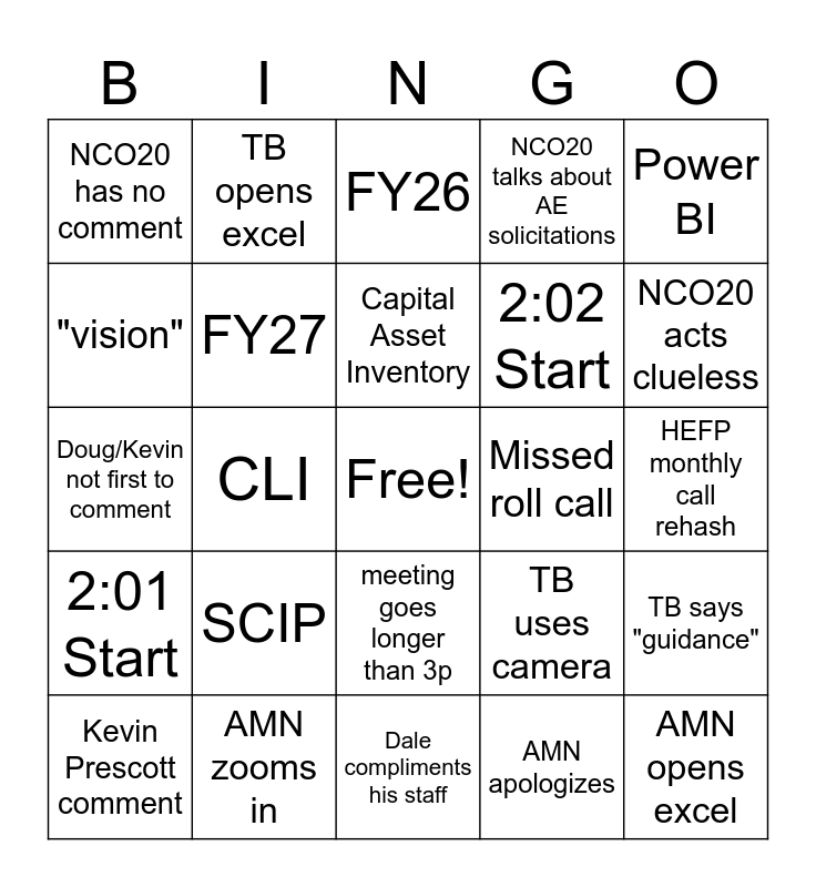 This bingo card has a free space and 27 words: TB uses camera, Leases, 2:02 Start, Dale compliments his staff, "vision", FY26, TB opens excel, 2:01 Start, Missed roll call, TB says "guidance", Doug/Kevin not first to comment, NCO20 talks about AE solicitations, Kevin Prescott comment, AMN zooms in, NCO20 acts clueless, meeting ends before 3p, FY27, Capital Asset Inventory, SCIP, NCO20 has no comment, HEFP monthly call rehash, AMN apologizes, CLI, AMN opens excel, meeting goes longer than 3p, Power BI and PTR.