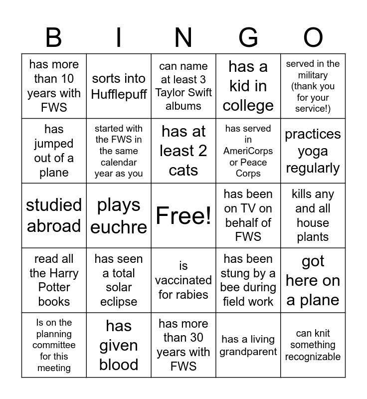 This bingo card has a free space and 56 words: Is going on your field trip or to your workshop session, Is on the planning committee for this meeting, has more than 20 years with FWS, has more than 10 years with FWS, has more than 30 years with FWS, has less than one year with FWS R3 ES, started with the FWS in the same calendar year as you, has seen an EMR in the wild, has served in AmeriCorps or Peace Corps, bikes or walks to work (even occasionally), has a kid in college, is wearing the same color shirt as you, doesn’t like coffee, plays or played the saxophone, was in marching band, plays pickleball, served in the military (thank you for your service!), plays euchre, has a pet other than a cat or dog, can knit something recognizable, has been on TV on behalf of FWS, can give you a Ted Lasso quote on the spot, has been stung by a bee during field work, can name at least 3 Taylor Swift albums, has been to Alaska, has at least 2 cats, you haven’t met yet, wears glasses, practices yoga regularly, has been to a Packers game, has worked in another region, has completed a triathlon (any distance), likes board games, has a vegetable garden, kills any and all house plants, has jumped out of a plane, studied abroad, ran a marathon, read all the Harry Potter books, sorts into Hufflepuff, is vaccinated for rabies, is SCUBA-certified, has moved in the past 6 months, has been to a concert in the past year, has out of the country in the past year, has seen a total solar eclipse, has given blood, has a tattoo, has never used a floppy disk, has blue eyes, has a living grandparent, has been on a cruise ship, has lived in more than 8 states, has a degree in something without “ology” in the title, got here on a plane and has more than 3 siblings.