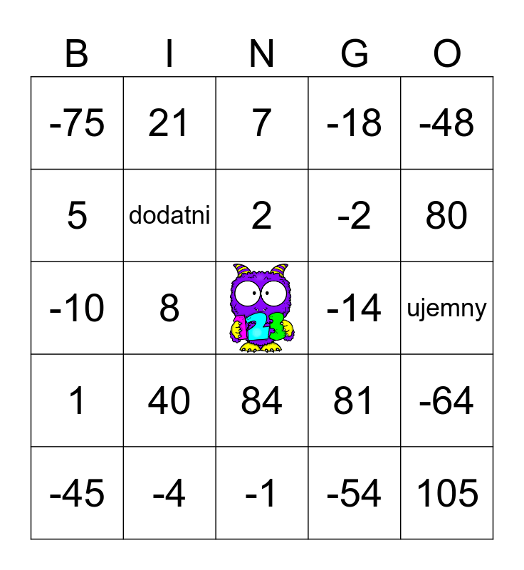 This bingo card has a free space and 24 words: 40, -4, 2, -45, -48, -75, 5, 21, -14, 84, -2, -10, 81, -64, dodatni, -54, ujemny, 7, 80, 8, 105, 1, -18 and -1.