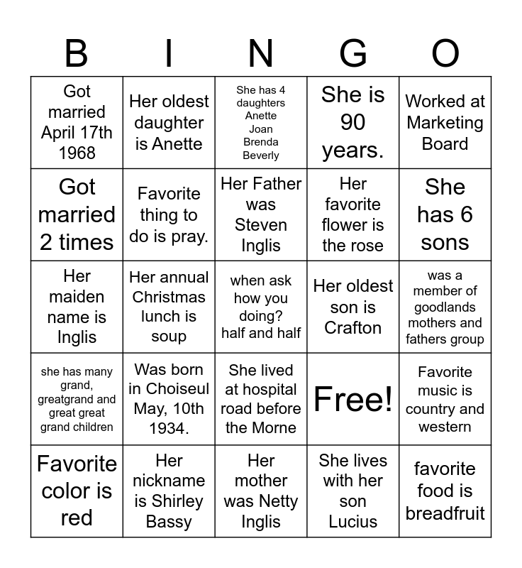 This bingo card has 25 words: Was born in Choiseul May, 10th 1934., Her mother was Netty Inglis, Her Father was Steven Inglis, Favorite color is red, Worked at Marketing Board, Got married April 17th 1968, Got married 2 times, Her oldest daughter is Anette, Her oldest son is Crafton, She lived at hospital road before the Morne, Her favorite flower is the rose, Her maiden name is Inglis, Free!, Favorite music is country and western, Favorite thing to do is pray., favorite food is breadfruit, was a member of goodlands mothers and fathers group, She has 4 daughters Anette Joan Brenda Beverly, She has 6 sons, Her annual Christmas lunch is soup, when ask how you doing? half and half, Her nickname is Shirley Bassy, she has many grand, greatgrand and great great grand children, She is 90 years. and She lives with her son Lucius.