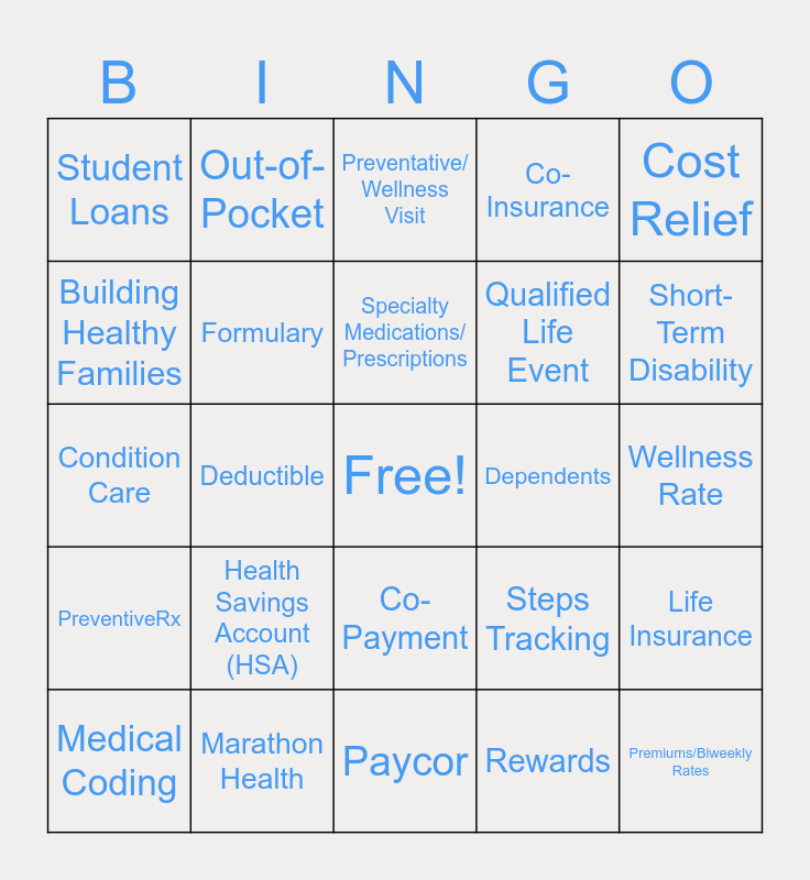 This bingo card has a free space and 41 words: Compliance, Condition Care, Wellbeing Coach, Formulary, Marathon Health, Co-Payment, Specialty Medications/ Prescriptions, CarelonRx, Cost Relief, PreventiveRx, Deductible, Co-Insurance, Premiums/Biweekly Rates, Wellness Rate, Dependents, Health Savings Account (HSA), Flexible Spending Account (FSA), Student Loans, In-Network, Preventative/ Wellness Visit, Life Insurance, Beneficiary, Paycor, Qualified Life Event, Primary Care Physician, Preventive Care Campaign, Rewards, Out-of-Network, Short-Term Disability, Long-Term Disability, Pre-tax Benefit, Out-of-Pocket, Medical Coding, Wellness Program, Steps Tracking, Building Healthy Families, AblePay, Peanut Butter, Lincoln Financial, Claims and HIPAA.