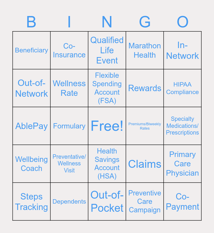 This bingo card has a free space and 40 words: Building Healthy Families, AblePay, Condition Care, Wellness Rate, Dependents, Health Savings Account (HSA), Flexible Spending Account (FSA), Student Loans, In-Network, Wellbeing Coach, Formulary, Marathon Health, Co-Payment, Specialty Medications/ Prescriptions, Premiums/Biweekly Rates, Preventative/ Wellness Visit, Life Insurance, Beneficiary, Paycor, Qualified Life Event, Primary Care Physician, Preventive Care Campaign, Rewards, Out-of-Network, Short-Term Disability, Long-Term Disability, Pre-tax Benefit, CarelonRx, Cost Relief, PreventiveRx, Deductible, Steps Tracking, Lincoln Financial, Claims, HIPAA Compliance, Out-of-Pocket, Medical Coding, Wellness Program, Co-Insurance and Peanut Butter.