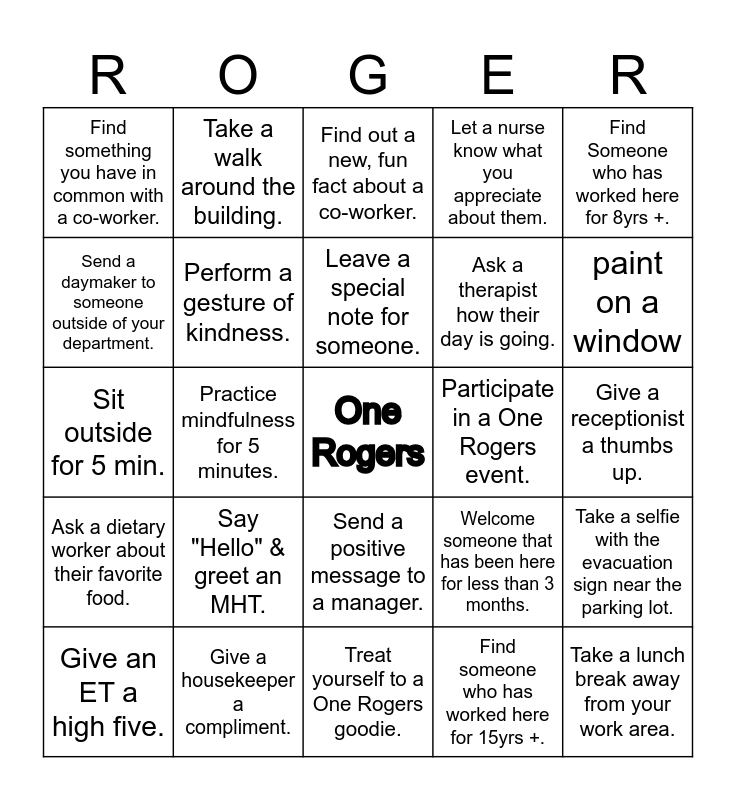 This bingo card has a free space and 24 words: Say "Hello" & greet an MHT., Give a housekeeper a compliment., Leave a special note for someone., Give an ET a high five., Find Someone who has worked here for 8yrs +., Find something you have in common with a co-worker., Send a daymaker to someone outside of your department., Take a walk around the building., Participate in a One Rogers event., Send a positive message to a manager., Ask a therapist how their day is going., Sit outside for 5 min., Welcome someone that has been here for less than 3 months., Take a selfie with the evacuation sign near the parking lot., Perform a gesture of kindness., Find someone who has worked here for 15yrs +., Give a receptionist a thumbs up., Find out a new, fun fact about a co-worker., paint on a window, Practice mindfulness for 5 minutes., Take a lunch break away from your work area., Ask a dietary worker about their favorite food., Let a nurse know what you appreciate about them. and Treat yourself to a One Rogers goodie..