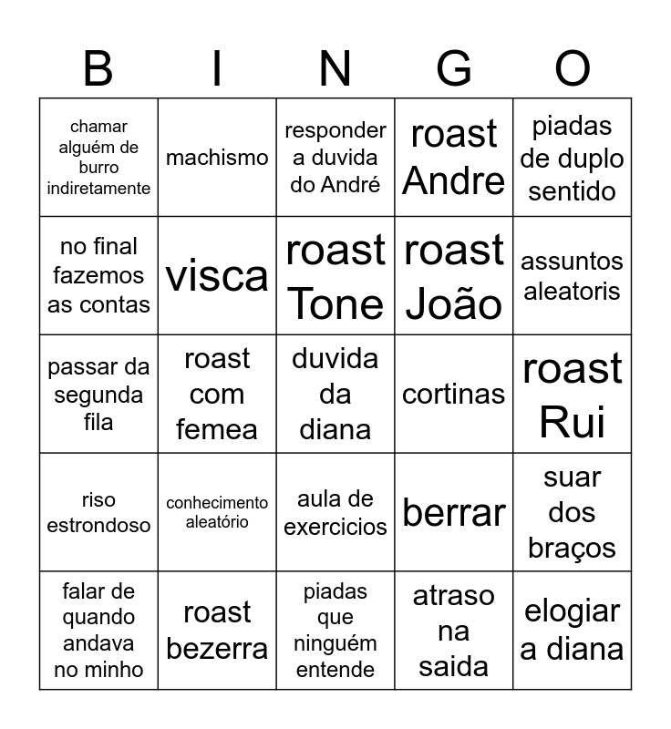 This bingo card has a free space and 38 words: olhar serio a expliacar, queixar do atraso, bafo na beiça, visca, suar dos braços, conhecimento aleatório, roast Tone, barulhos aleatórios, piadas de duplo sentido, roast João, roast com femea, roast Andre, elogiar a diana, roast Rui, no final fazemos as contas, riso estrondoso, reclamar da duvida do Tone, responder a duvida do André, modo assediador, cortinas, chamar alguém de burro indiretamente, roast bezerra, assuntos aleatoris, falar de quando andava no minho, homofobico, piadas que ninguém entende, engasgamento, eclipse, por a mão na mesa, trocar a pagina no livro dos outros, por vídeo, aula de exercicios, atraso na saida, machismo, chips de gente da turma, berrar, passar da segunda fila and errar no portugues.