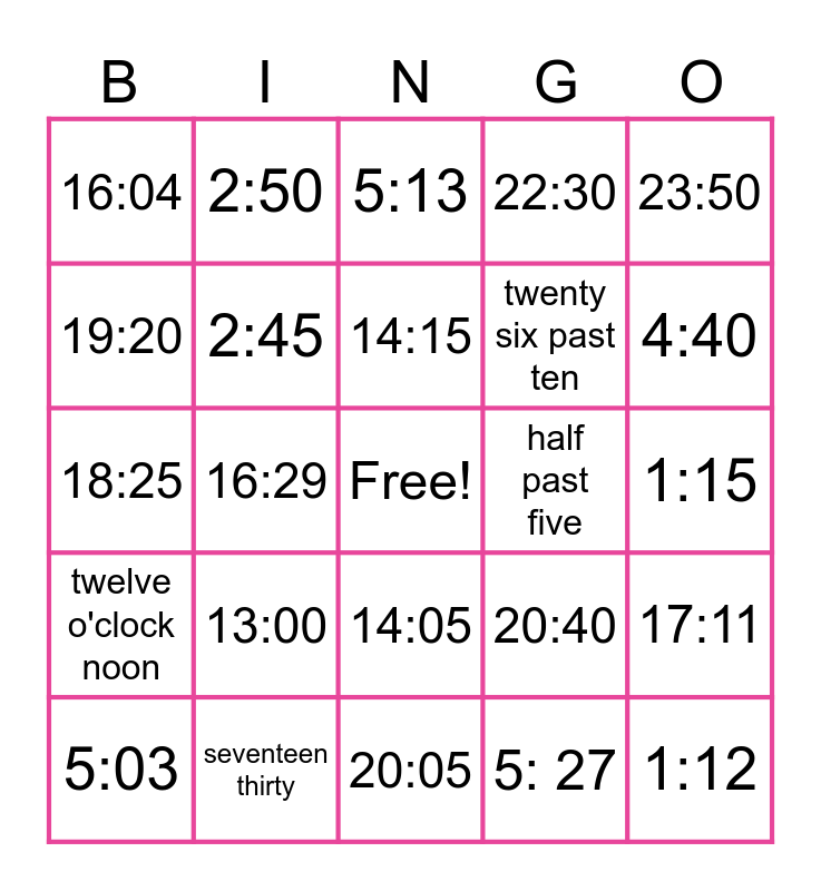 This bingo card has a free space and 69 words: quater to one, 0:15, 1:30, 1:00, 1:15, 2:00, 2:45, 3:15, twenty six past ten, 4:35, twelve o'clock noon, 12:50, 22:30, 23:50, 13:30, 13:00, 14:15, half past five, 17:45, 18:25, seventeen thirty, 20:05, 20:40, 21:15, 0:25, 1:05, 0:45, 0:51, 1:12, 2:05, 2:50, 2:16, 3:25, 3:40, 3:55, 4:08, 4:15, 4:32, 4:40, 5:03, 5:55, 5:13, 5: 27, 5:21, 13:15, 13:55, 14:05, 14:45, 16:56, 16:04, 16:29, 17:30, 17:50, 17:11, 18:20, 18:05, 18: 44, 19:35, 19:18, 19:20, 20:20, 21:20, 21: 35, 22:05, 22: 15, 22: 35, 23:30, 23:05 and 23:55.