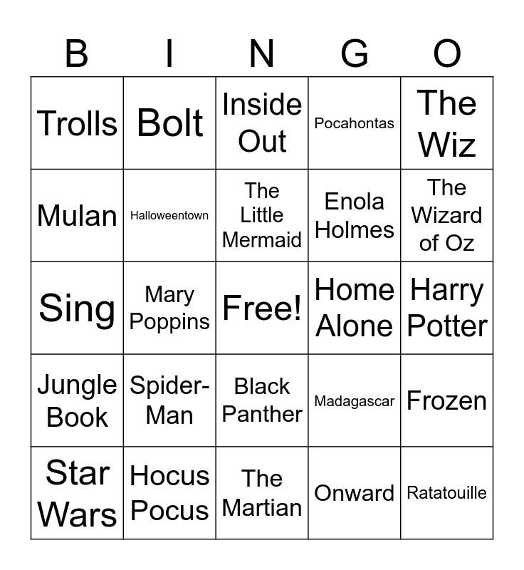 This bingo card has a free space and 42 words: Aladdin, The Little Mermaid, Little Rascals, Spider-Man, Onward, Frozen, Ratatouille, The Lion King, Inside Out, Black Panther, Harry Potter, The Wizard of Oz, Mary Poppins, The Wiz, Cinderella, Madagascar, Ice Age, Sing, Despicable Me, Bolt, Mulan, Princess and the Frog, Mighty Ducks 3, Trolls, Charlotte’s Web, The Karate Kid, Enola Holmes, Ralph Breaks the Internet, How to Train a Dragon, Diary of a Wimpy Kid, Finding Nemo, Jungle Book, Halloweentown, The Martian, Abominable, Star Wars, Hocus Pocus, Home Alone, Wreck It Ralph, Annie Matilda, Pocahontas and Toy Story.