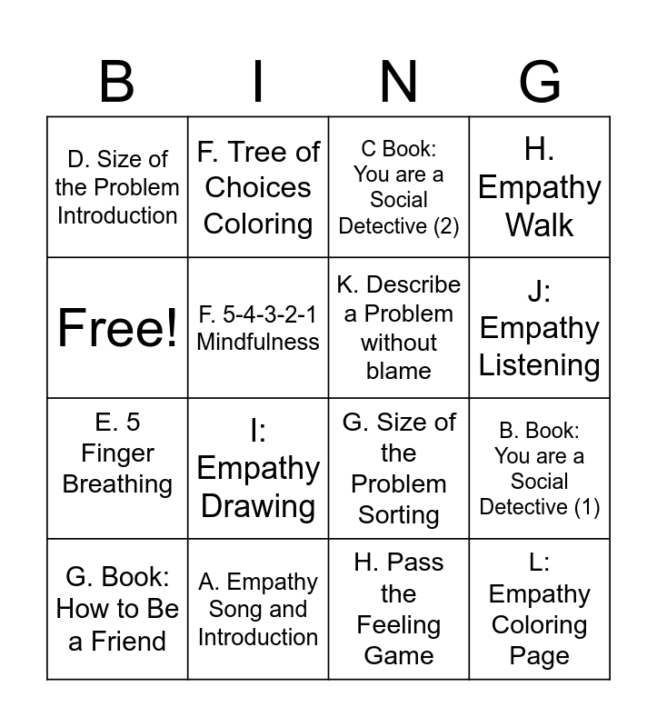 This bingo card has 16 words: A. Empathy Song and Introduction, B. Book: You are a Social Detective (1), C Book: You are a Social Detective (2), D. Size of the Problem Introduction, E. 5 Finger Breathing, F. Tree of Choices Coloring, G. Size of the Problem Sorting, H. Pass the Feeling Game, Free!, F. 5-4-3-2-1 Mindfulness, G. Book: How to Be a Friend, H. Empathy Walk, I: Empathy Drawing, J: Empathy Listening, K. Describe a Problem without blame and L: Empathy Coloring Page.