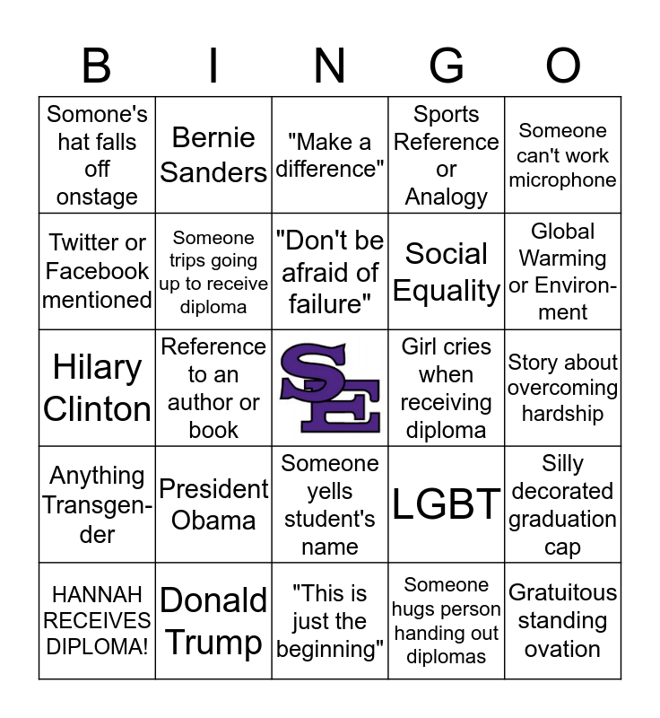 This bingo card has a free space and 24 words: President Obama, Donald Trump, "Don't be afraid of failure", HANNAH RECEIVES DIPLOMA!, Someone can't work microphone, Somone's hat falls off onstage, Twitter or Facebook mentioned, Bernie Sanders, Girl cries when receiving diploma, Someone yells student's name, Social Equality, Hilary Clinton, LGBT, Silly decorated graduation cap, Someone trips going up to receive diploma, Someone hugs person handing out diplomas, Story about overcoming hardship, "Make a difference", Global Warming or Environ- ment, Reference to an author or book, Gratuitous standing ovation, Anything Transgen- der, Sports Reference or Analogy and "This is just the beginning".