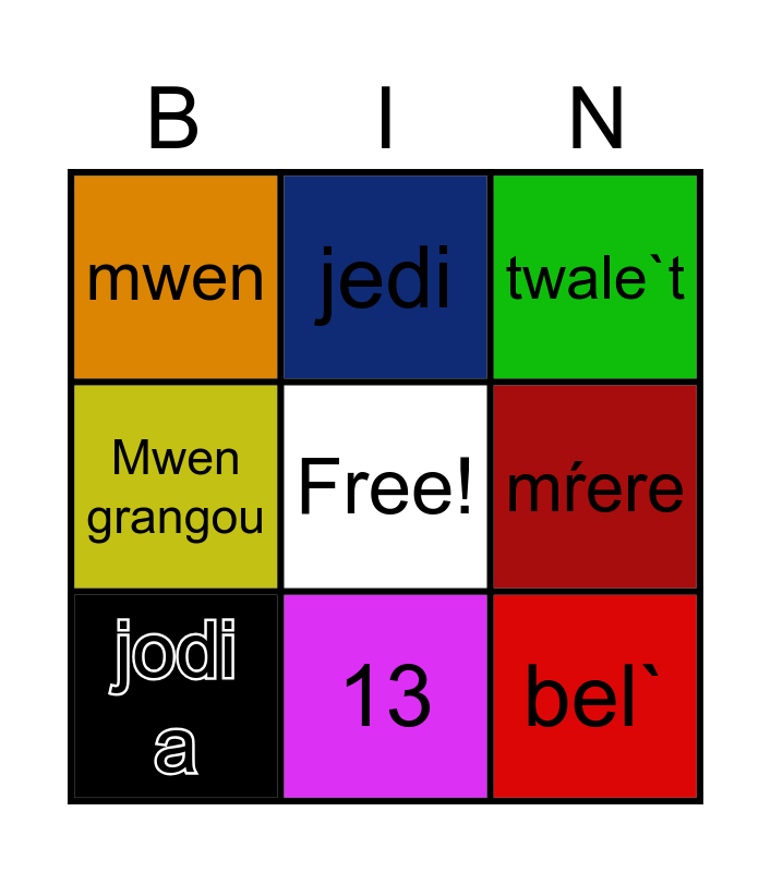 This bingo card has a free space and 8 words: Mwen grangou, jedi, mŕere, jodi a, twale`t, mwen, 13 and bel`.