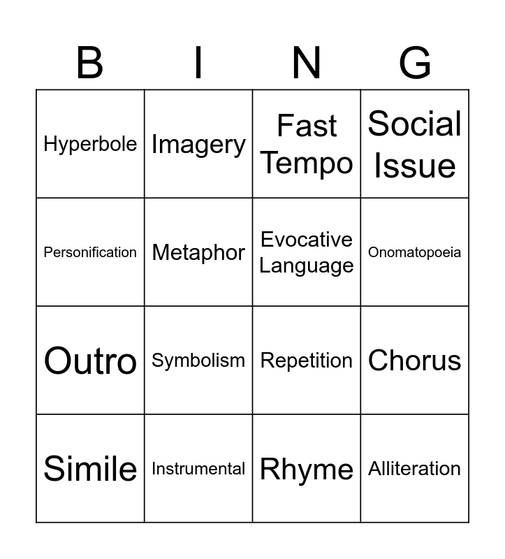 This bingo card has 16 words: Instrumental, Chorus, Fast Tempo, Hyperbole, Outro, Imagery, Repetition, Rhyme, Personification, Metaphor, Simile, Social Issue, Symbolism, Onomatopoeia, Evocative Language and Alliteration.