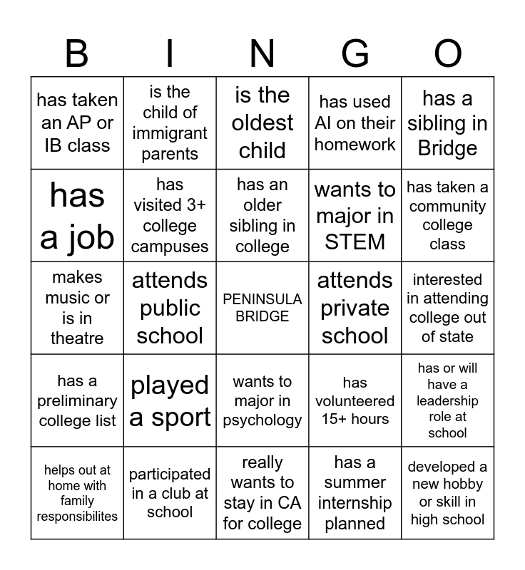 This bingo card has a free space and 24 words: played a sport, participated in a club at school, has an older sibling in college, helps out at home with family responsibilites, has a sibling in Bridge, has taken an AP or IB class, has a job, is the child of immigrant parents, attends private school, wants to major in psychology, wants to major in STEM, makes music or is in theatre, has volunteered 15+ hours, has or will have a leadership role at school, has visited 3+ college campuses, has a summer internship planned, interested in attending college out of state, is the oldest child, has taken a community college class, attends public school, developed a new hobby or skill in high school, has a preliminary college list, has used AI on their homework and really wants to stay in CA for college.