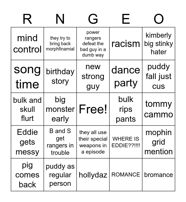 This bingo card has a free space and 24 words: B and S get rangers in trouble, puddy as regular person, new strong guy, pig comes back, kimberly big stinky hater, mind control, song time, they try to bring back morphfinamial, bulk rips pants, they all use their special weapons in a episode, dance party, bulk and skull flurt, WHERE IS EDDIE??!!!!, mophin grid mention, birthday story, ROMANCE, tommy cammo, power rangers defeat the bad guy in a dumb way, puddy fall just cus, big monster early, bromance, Eddie gets messy, racism and hollydaz.