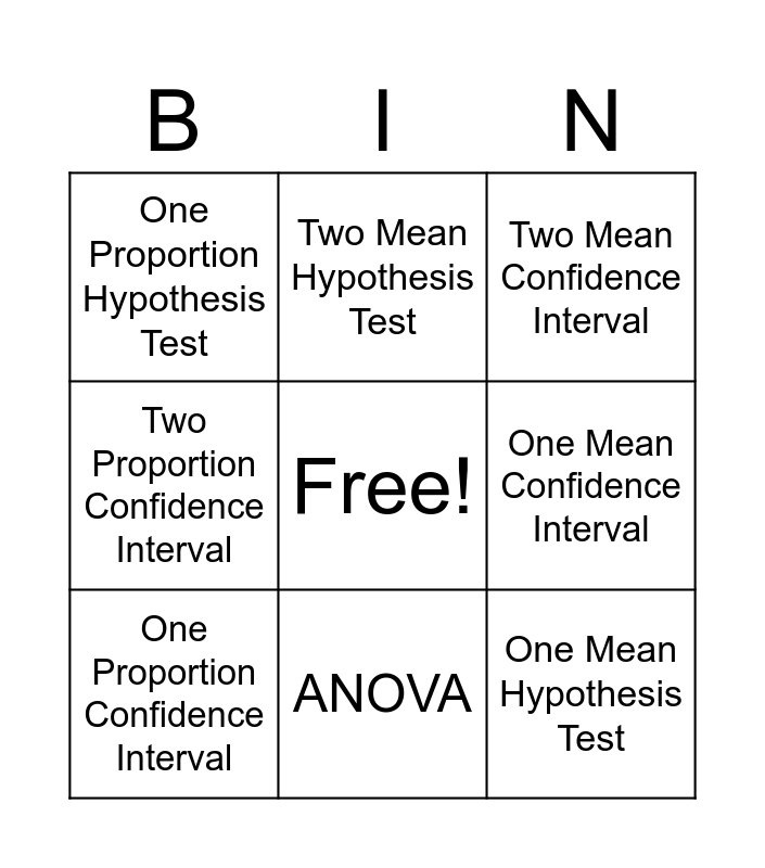 This bingo card has a free space and 12 words: Correlation, Linear Regression, One Mean Hypothesis Test, One Mean Confidence Interval, Two Mean Hypothesis Test, Two Mean Confidence Interval, ANOVA, Paired Means Hypothesis Test, One Proportion Hypothesis Test, Two Proportion Confidence Interval, One Proportion Confidence Interval and Two Proportion Hypothesis Test.