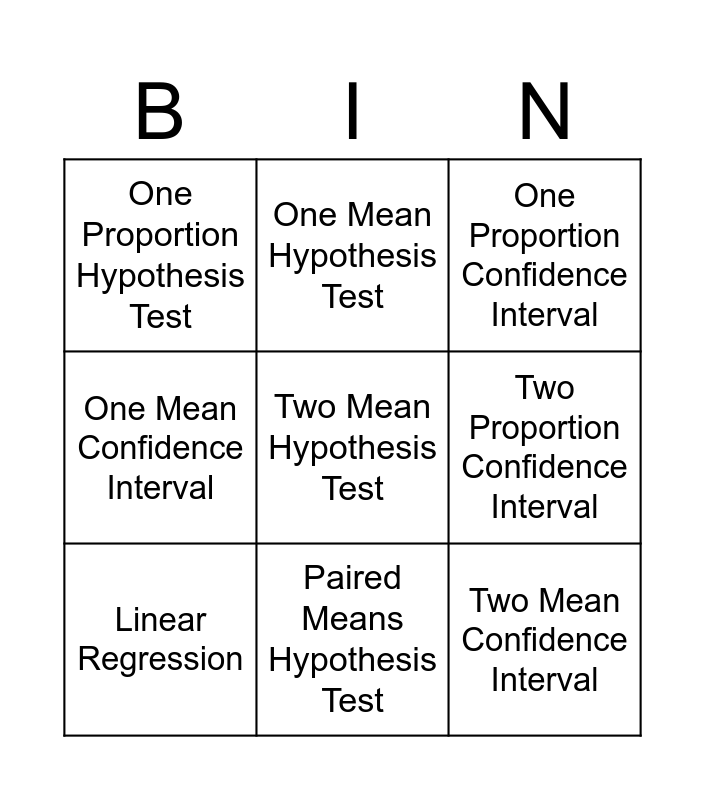 This bingo card has 13 words: Free!, Correlation, Linear Regression, One Mean Hypothesis Test, One Mean Confidence Interval, Two Mean Hypothesis Test, Two Mean Confidence Interval, ANOVA, Paired Means Hypothesis Test, One Proportion Hypothesis Test, Two Proportion Confidence Interval, One Proportion Confidence Interval and Two Proportion Hypothesis Test.