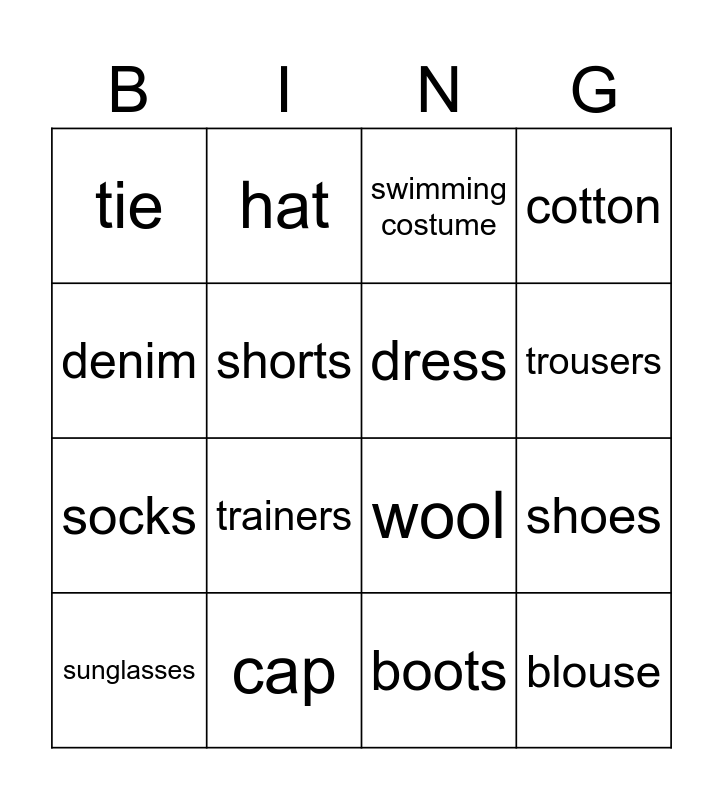 This bingo card has 17 words: boots, sunglasses, swimming costume, tie, trainers, cotton, shoes, dress, trousers, shorts, cap, wool, denim, hat, socks, scarf and blouse.