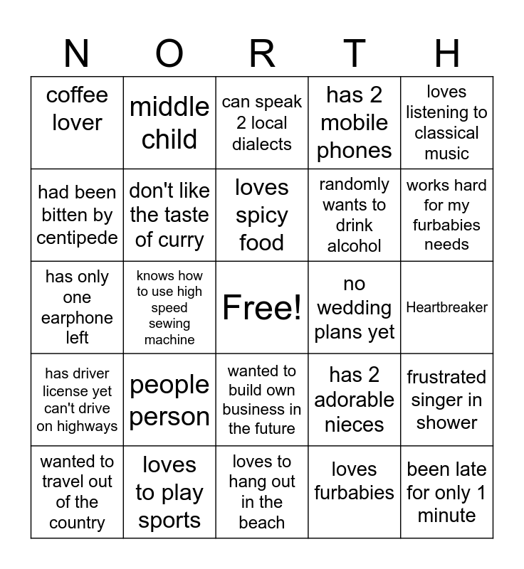 This bingo card has a free space and 24 words: people person, loves to play sports, loves spicy food, wanted to travel out of the country, loves listening to classical music, coffee lover, had been bitten by centipede, middle child, no wedding plans yet, wanted to build own business in the future, randomly wants to drink alcohol, has only one earphone left, has 2 adorable nieces, frustrated singer in shower, don't like the taste of curry, loves furbabies, Heartbreaker, can speak 2 local dialects, works hard for my furbabies needs, knows how to use high speed sewing machine, been late for only 1 minute, has driver license yet can't drive on highways, has 2 mobile phones and loves to hang out in the beach.